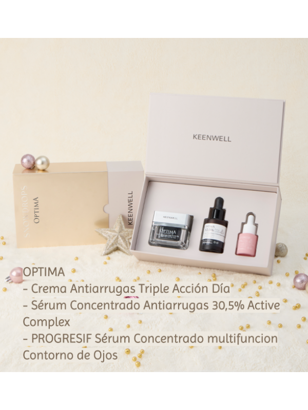 PACK OPTIMA de Keenwell. Contiene Crema Antiarrugas Triple Accion Día, Sérum Concentrado Antiarrugas 30,5% de Complejos activos y PROGRESIF Sérum Concentrado multifuncional para el Contorno de Ojos.